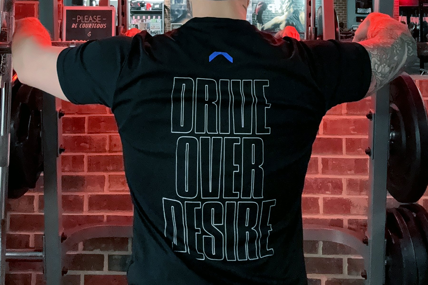 Tailored made for maximum performance, these moisture-wicking tees provide the perfect balance of breathability and comfort whether you're going 8 rounds in the ring or taking a rest day. Proudly featuring our logo on the front, this tee sports a mantra reminding us that while many have a DESIRE to do hard things, only those with DRIVE can get them done.